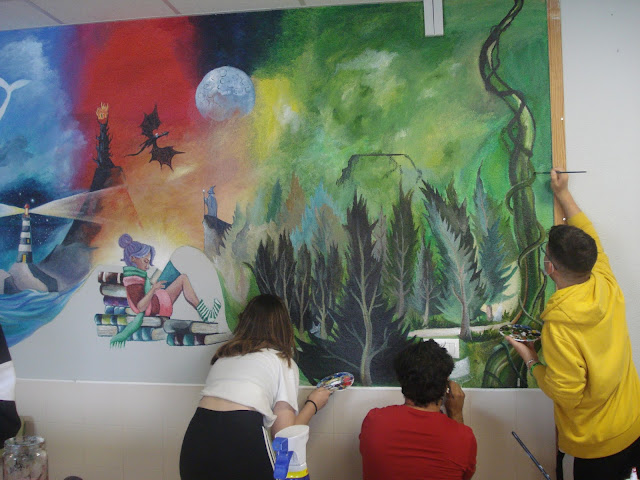 La última entrada del curso tiene por finalidad compartir con los lectores del blog el desarrollo del mural cuyo boceto quedó ininterrumpido aquel lejano 13 de marzo en que nos apresurábamos a ponernos al día con Classroom antes de iniciar el confinamiento en casa. El Equipo de Biblioteca se hallaba inmerso en una serie de formaciones a raíz de un PAMCE para dinamizar la biblioteca y conseguir atraer mayor cantidad de lectores con buenas o malas artes 😎